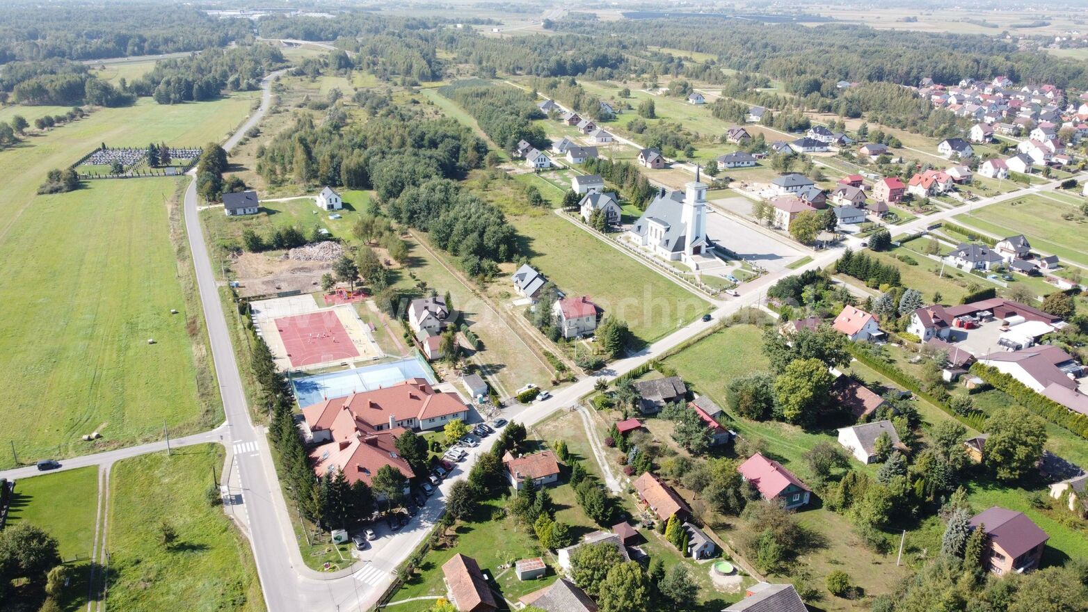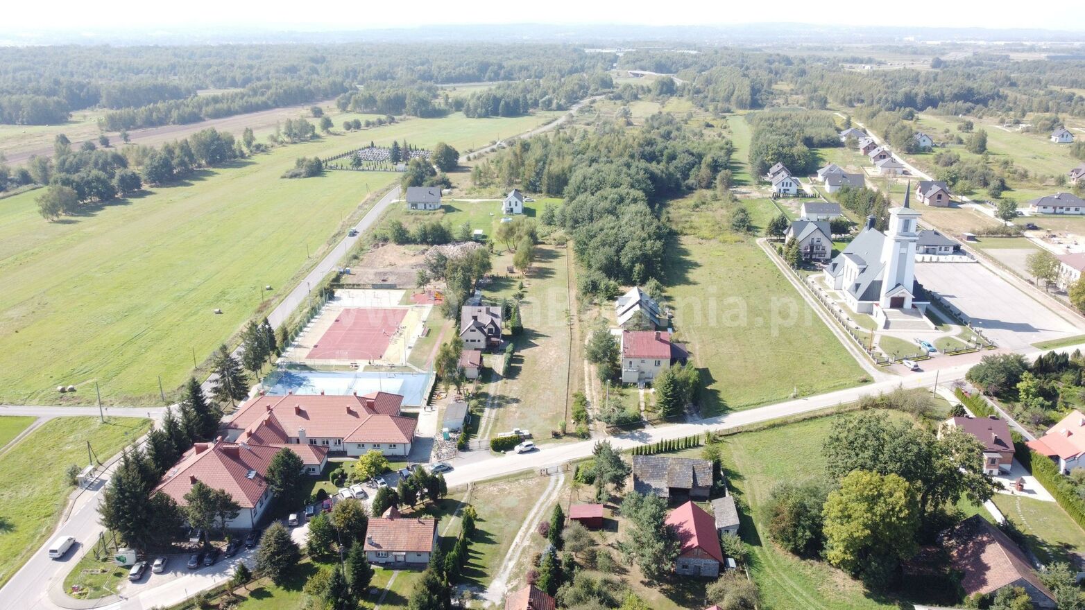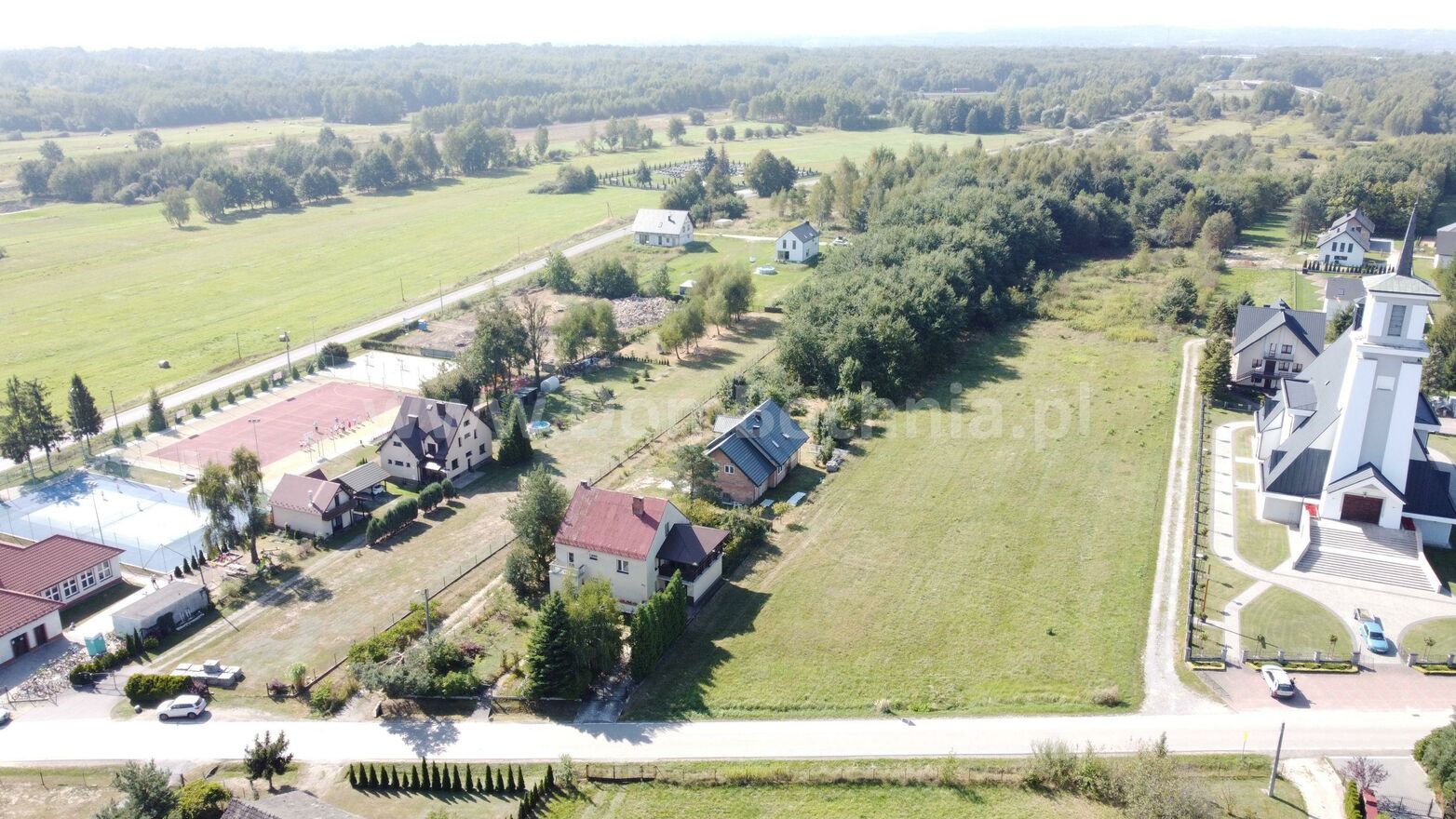 Sąsiedztwo : szkoła podstawowa, przedszkole, korty tenisowe i Kościół.